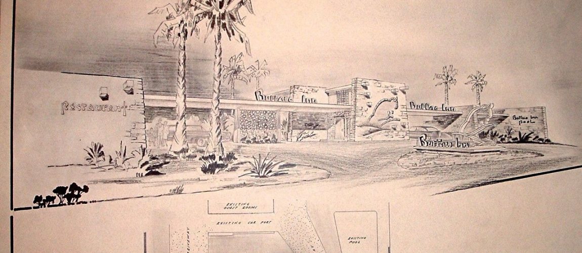 Architect Allen Williams updated the Buffalo Inn Hotel in the mid 1950`s by adding a nifty two-story masonry signature wall and connecting other buildings with walls and canopies. The canopy closest to the pool was used as a sun deck. Note the abstract buffalo logo Williams designed. It was based on Indian drawings and incorporated into the stone building facade. The image is also used as an iron sculpture, lit by a `fountain of colored lights`, located close to the road. By 1969 the inn had been renamed the King Motor Lodge. In 2002, Harris County purchased the property for use as a parking area for the Astrodome.