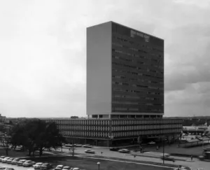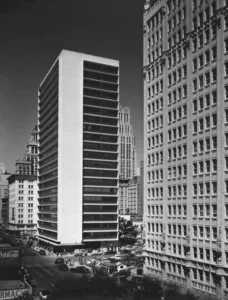 During the 1940s and 1940s Krakower along with such other Houston architects as Mackie & Kamrath, Wilson, Morris & Crain, and Lloyd & Morgan designed modern, suburban office buildings with an intimate, domestic scale. The crisply detailed Houston Compressed Steel Corp. building with its many references to the ranch house is an excellent example of this trend. The building is located in section of Houston where rapid residential development, mostly in the form of multi-story townhouses has been replacing the original light industrial operations established in the first decades of the twentieth century.