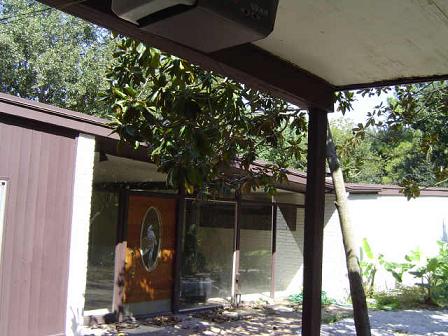 behind the gated entrance. From the side, one can see that the house actually has a butterfly roof. Unfortunately, this