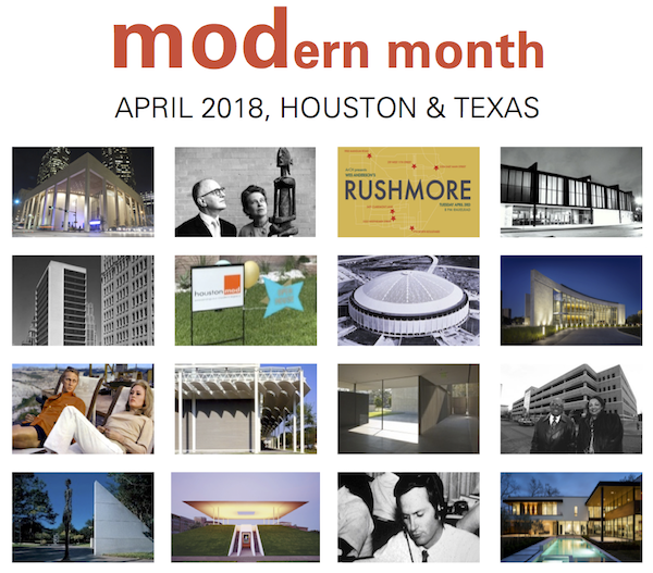 Houston Mod established MODern Month in April 2010 to bring attention to the importance of protecting modern architecture and design in Houston and Texas. In 2011 Preservation Texas expanded the program to a state-wide focus. Below is a list of events in Houston with a MOD twist throughout the month of April hosted by several of Houston Mod’s favorite organizations and institutions. Check in at HoustonMod.org or the Houston Mod Facebook Page for updates. We wish you a happy MODern Month and hope to see you at an event or two!