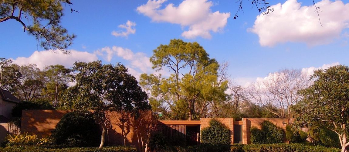 Joel Brand, FAIA designed this expansive modern house featuring broad plate glass walls opening to partially walled landscaped gardens from most rooms. Many rooms are fitted with extensive built-in cabinetry. Joel Brand is a graduate of the University of Houston College of Architecture. He became registered to practice in Texas in 1966. He first worked for Howard Barnstone beginning in 1957 and later for Bolton & Barnstone before co-founding Brand & Allen in 1965. Joel Brand worked prolifically in the Houston area before moving to central Texas and later to the west coast.