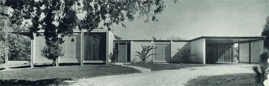 Gilbert and June Arnold commissioned this house; Mr. Arnold was an automobile underwriter for the American General Insurance Company. At the time, June Arnold was a homemaker. Later she divorced her husband, co-founded a feminist press in Vermont, Daughters, Inc., and gained fame as a critically acclaimed novelist. From the beginning they planned to enlarge the house. Burdette Keeland designed the partially steel framed addition built in 1956. By 1958, neither the Arnolds, nor the address, 5006 San Felipe Road, was listed in the city directory. It was likely at this time that the house was demolished. – Ben Koush `The site in southwest Houston is five wooded acres with a small ravine. It was decided to undertake the project in three stages of which this (pictured) is the second. The property is entered by way of an automobile turn-around through an open court. A spacious entry in the house itself serves as a small dining area with a view to the north through a landscaped court to the wooded ravine. The master bedroom, living area, and large kitchen family area are directly above this entry. The master bedroom with deck and provided with sliding wood lattice also overlooks the ravine. The kitchen and family area faces directly on its own south terrace with exposures toward the automobile turn-around and the children`s play yard to the southeast which is the direction of the prevailing breezes. The ceiling is suspended acoustical tile; the floor polished brick. The living area with the two children`s bedrooms which was part of the first stage of the project has a view of the ravine through its own terrace. The polished slate of the entry continues into the living area. all interior partitions are one-half gypsum board on load-bearing wood studding. Exterior finish materials are white painted brick, white painted structural steel and G vertical redwood siding left natural. All rooms, with the exception of the master bedroom are on a reinforced concrete slab on grade` – Unknown Publication. Possibly Texas Architect or Architectural Record. Architectural historian Stephen Fox say that this house was moved and reconfigured as a courtyard house at some point. It was last seen at the southeast corner of Potamac and Woodway drive, but is believed to have been demolished.