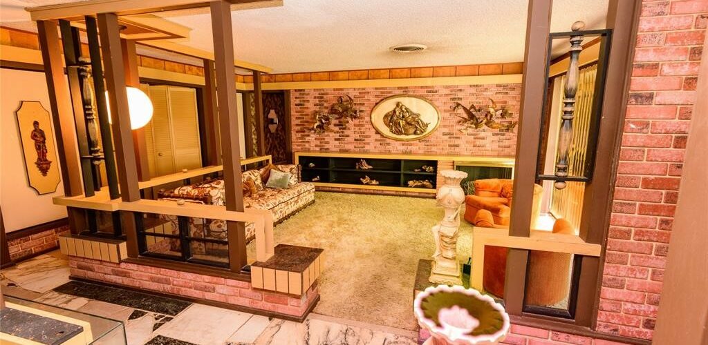Boldly contrasting horizontal and vertical elements make the P. R. Daniel house one of the most memorable in the Riverside Terrace area. Henry MacGregor developed Riverside Terrace starting in 1924 on picturesque rolling terrain along the banks of Braes Bayou between Hermann and MacGregor Parks. Architect Bailey Swenson designed the Daniel house in 1949 and construction began in early 1950 situated on a half acre plus site. Swenson is known for his uniquely inventive combination of organic and international styles of architecture. Even though one story spreading houses were desired in the 1950s, the neighborhood deed restrictions required houses to have two stories so the mother-in-law pop-up room was created. The house is composed of stone, brick and redwood and features an impressive array of built-in furnishings and a large abstract mural by prominent artist Jacques de la Marre who worked with Swenson on several projects.