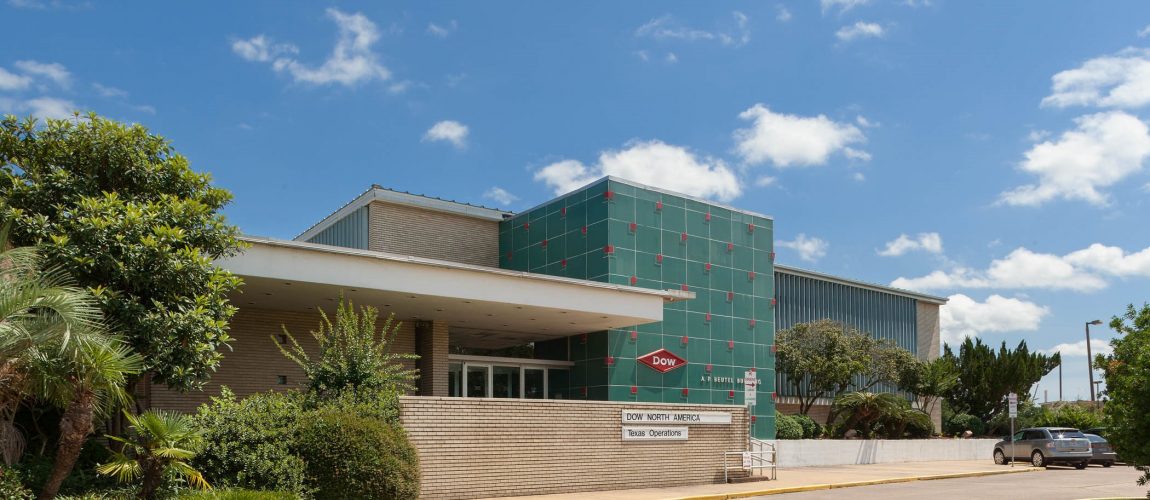 MacKie and Kamrath’s Dow Administration Center of 1957, (later the A.P. Beutel Building) was designed to house 400 Dow Chemical scientists, engineers, and executives and was the signature modern landmark of the area. Detailed in high Wrightian style by Houston’s foremost organic architectural firm, it was an enormous testament to the optimism of the late 1950s. The research wing contrasted a series of vertical ribs contrasting with a large entrance bay faced with deep green tiles. Just so the Wrightian influence could not possibly be overlooked, the green tiles were ornamented by bright red glossy squares in their corners, bringing both a contrasting color and a contrasting plane to the surface. The entry stair featured a canopy with open eaves and brightly colored squares of stained glass in a nod to both Wright’s and to Alden Dow’s influence. The office and conference wing emphasized the horizontal in contrast with the insistent verticality of the research wing. It was dominated by a cantilevered conference room on the second floor overlooking landscaped grounds. To the disappointment of many in the community, it was demolished in 2017 when Dow Chemical moved to their new headquarters and research center in Lake Jackson.