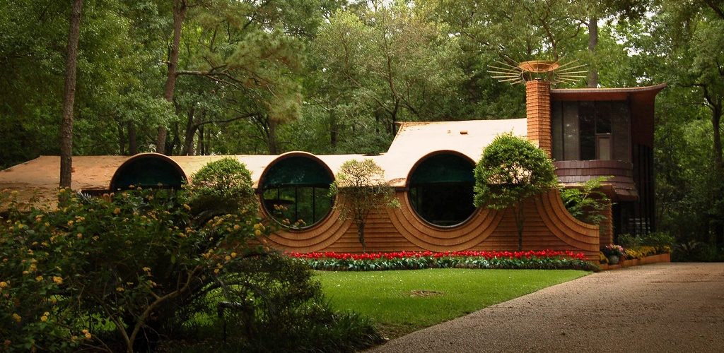 World reknown Oklahoma architect, Bruce Goff designed this house in the heavily wooded Piney Point area of Houston. The circular design of the house is inspired by the location of the house on a cul de sac. The motif is shown in the 3 large windows that appear almost to be giant eyes. Semi-circular bays also occur in the living room, terrace, master bedroom, and guest bedrooms.