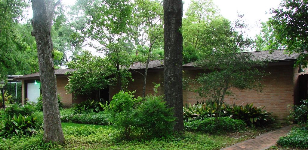 Alan Huvard, a builder and contractor for many of William Jenkins home designs, built this 2000 sq. ft. modern post and beam ranch house in 1955 on the Willowisp cul de sac in the Willowbend subdivision. The house is T shaped with the top of the T as the front of the house and garage.