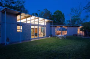 William R. Jenkins, FAIA, built his second house (the first house he built for his own use was on Evergreen St. in Bellaire and has since been demolished) in the then new Willowbend subdivision for himself and his family in 1955. He lived here for several years before moving to the nearby subdivision of Willow Meadows, where he lived (10002 Willowgrove) for the rest of his life. Upon building this house it was immediately recognized as an important modernist residence by the Houston architectural community. The house has no hallways, high ceilings, and uses space very efficiently. The house was also comparatively inexpensive at the time because the structure employed steel framing, large sheets of glass, sliding glass doors, and concrete blocks which are exposed on the interior of the house as well. Inside, however, marble countertops, floor to ceiling views from the bathrooms out to an enclosed atrium garden, the open floor plan, and high ceilings gave the house a sense of luxury.