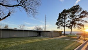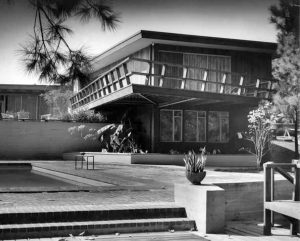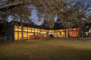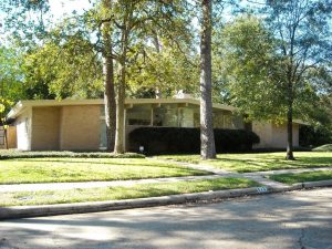 Set on a public street on a corner lot across the street from Rice University, architect David Red smartly set the front door around to the side of the house. Frank Lloyd Wright’s organic style weighs heavily on the two story home. The most notable feature of the house is that it originally had sod on a section of the roof, making it an early example of “green architecture”.