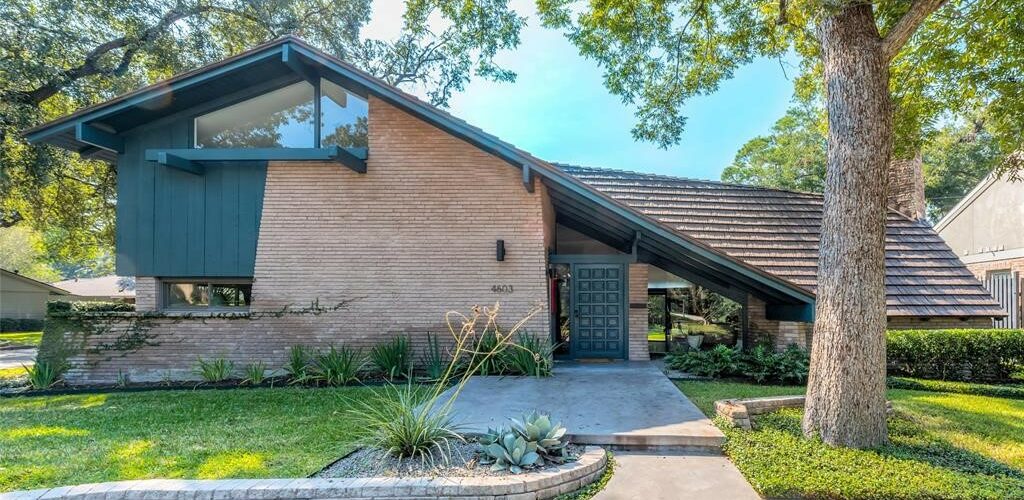 For their own home, architect Allen Williams and his wife Thesalone, an interior designer, were among the first to purchase a lot in Afton Oaks but waited six years to build while perfecting their design. The result is this unique and still stunning modernistic composition in brick glass and wood. This was the Williams’ opportunity to be bold without questioning clients. Soaring ceilings, large expanses of glass, multiple levels, and free flowing brickwork compose the central living spaces. A triangular theme is carried through in window shapes and the openings in the brick columns providing the conditioned air.