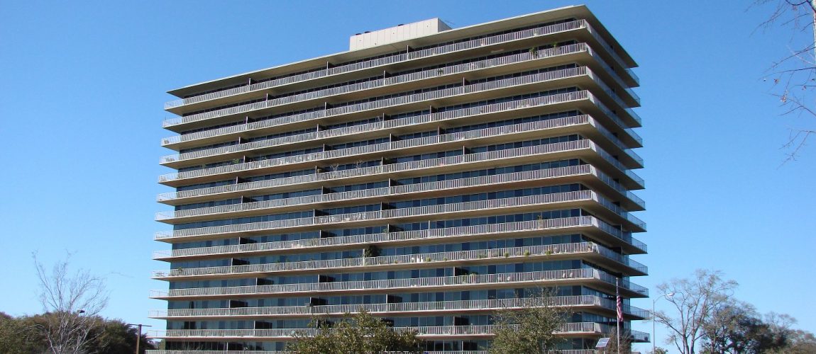 This building designed for Gerald Hines was Harwood Taylor’s first essay in highrise living. The exteriors were staid but the plans were well organized. On the top levels there were expansive two-story studio apartments with outdoor terraces and the requisite fallout shelter was tucked away in the basement. Landscaping of the one acre site was by Fred Buxton and interiors were by Lenora Detering.