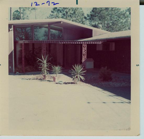 of the street. The rear of the living room has floor-to-ceiling windows. Previous owners had added a small covered awning to the back patio in the 1960s but that was eventually removed by the current owners.