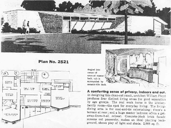 | Architectural Comments: | Like the twin on Electra, Floyd used geometric patterns to design this home. The front bedroom, for example, is hexagonal in design. The garage also features a pointed side wall that lines up with the point of the front bedroom. The walls separating the living room, family room and dining room have been removed to create one large living area. A small raised atrium features a fountain and a planting area. |