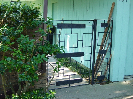 | Architectural Comments: | A low pitched gabled roof with clerestory windows is located over what is certainly a common area. A geometric-patterened gate leads towards the home's entry. |