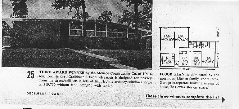 | Architectural Comments: | In many ways this home appears almost the same as it did from 1958 as it was easy to identify as the one featured in the article. The home was awarded a third prize from American Builder in a nationwide contest of model homes. The home utilizes clerestory windows above a series of sliding windows in each front bedroom. |
