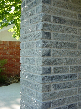 The brick has recently been painted white but the natural gray color can still be seen on the column supporting the carport. A wing wall transitions from the brick facade to siding that leads to the home's side entrance. |