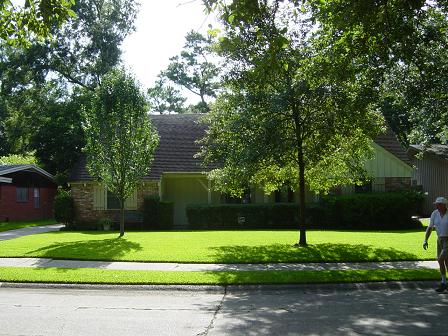 A traditional ranch-style house with rustic plank shutters. Note the diagonal supports on the top of each porch column.