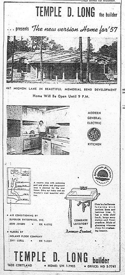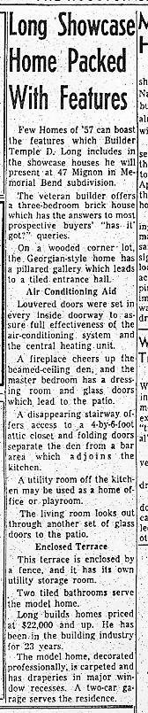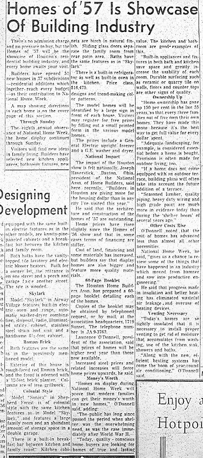 | Publication: | Houston Chronicle - September 16, 1956 Houston Chronicle - September 16, 1956 article on the Homes of '57 Houston Chronicle - September 16, 1956 advertisement | |
