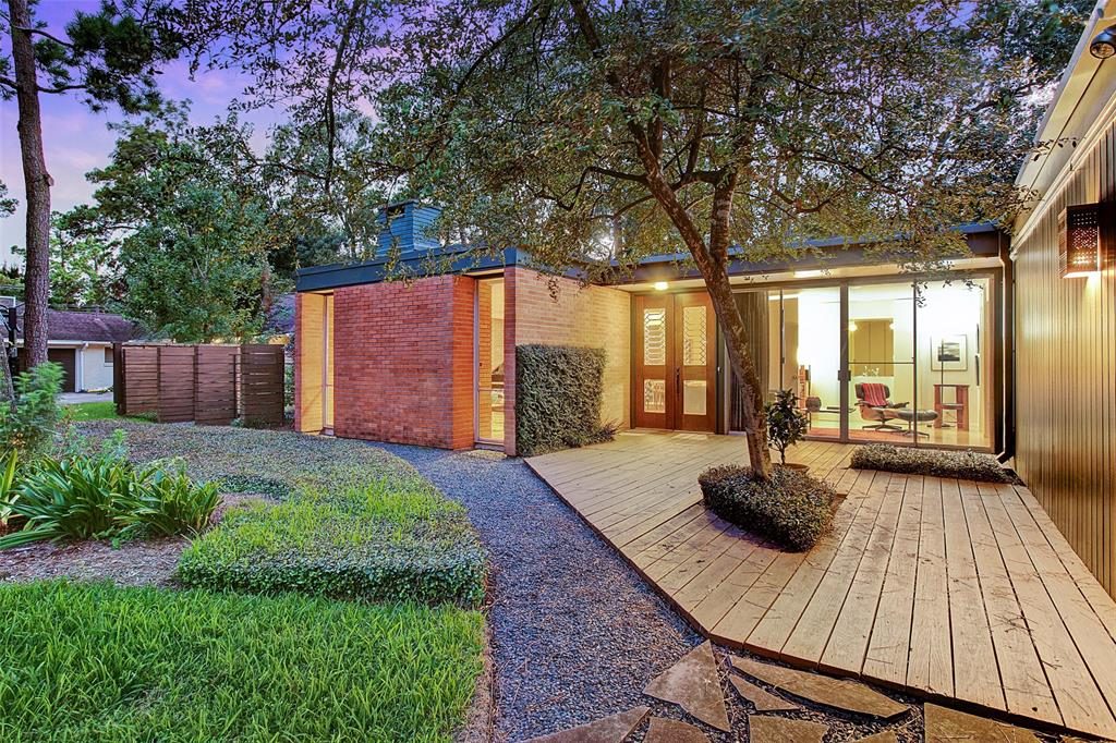 The enduring value of good design is evident in the 1964 house by architect Tom McKittrick designed for his own family in the small city of Hilshire Village. Floor to ceiling glass joins brick planes at decked patio spaces, blurring the bounds of indoors and out. Spaces are ample and flow freely across the original poured terrazzo floor beneath the flat-roofed structure which has been maintained by the architect’s family as he envisioned. The compound also includes a 1970 studio/guest house with a spectacular double volume central space and loft. The house was featured in a 1966 Better Homes and Gardens publication.